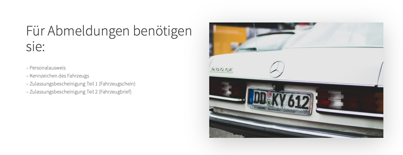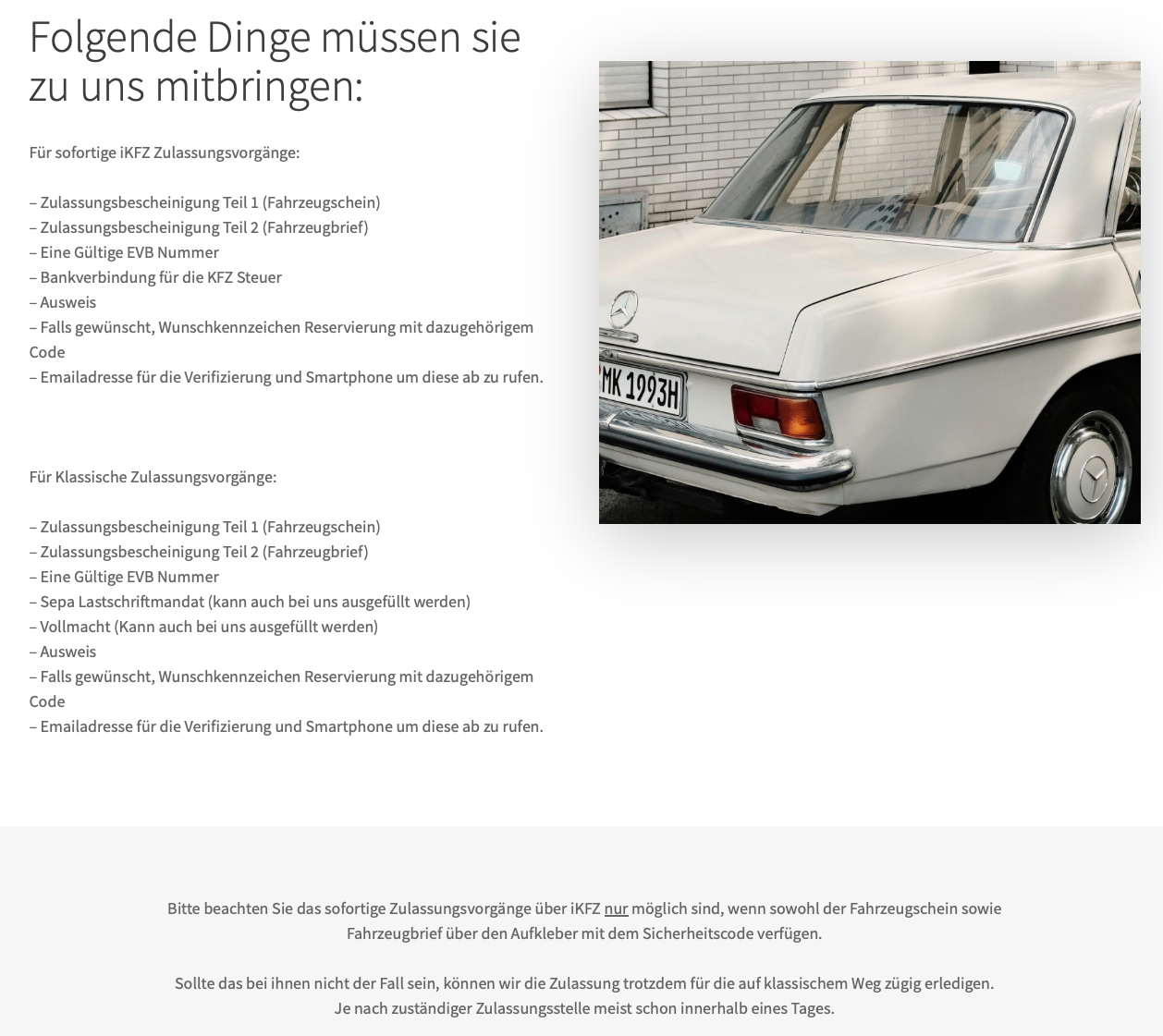 Der Unterschied zwischen einem herkömmlichen Zulassungsdienst und uns ist, dass Sie nach einer kurzen Bearbeitung mit Ihrer fertigen Zulassung losfahren können und nicht bis zum nächsten Tag warten müssen. Das geht deshalb, weil wir eine sofortige Bearbeitung online über unsere Onlinesoftware vornehmen können, die das direkte Zulassen Ihres KFZ ermöglicht. Was Sie dazu benötigen finden Sie